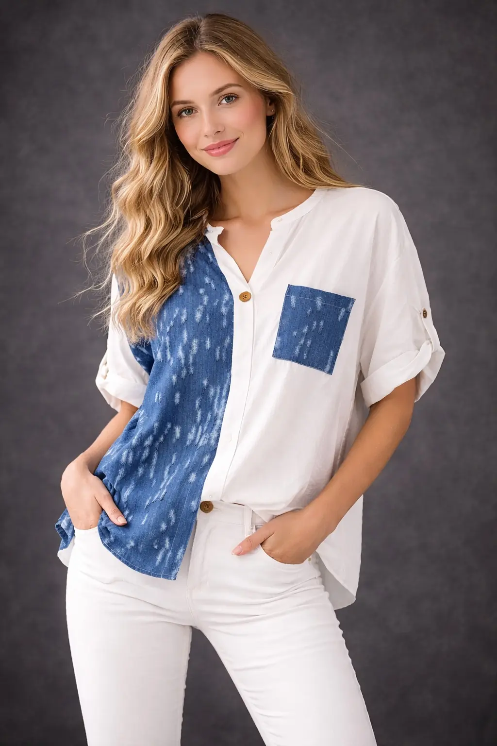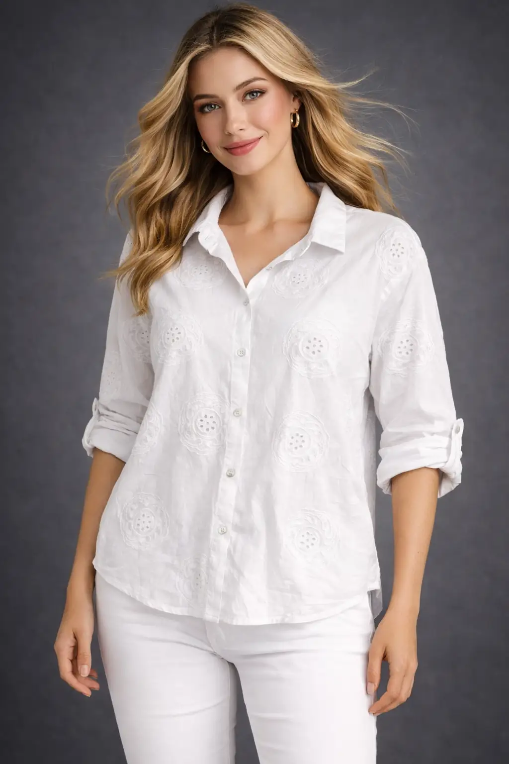 Gömleğin üzerindeki spiral kabartma detayları gerçekten çok şık. Düz beyaz gömleklerden çok daha farklı duruyor. Kumaşı da oldukça kaliteli.