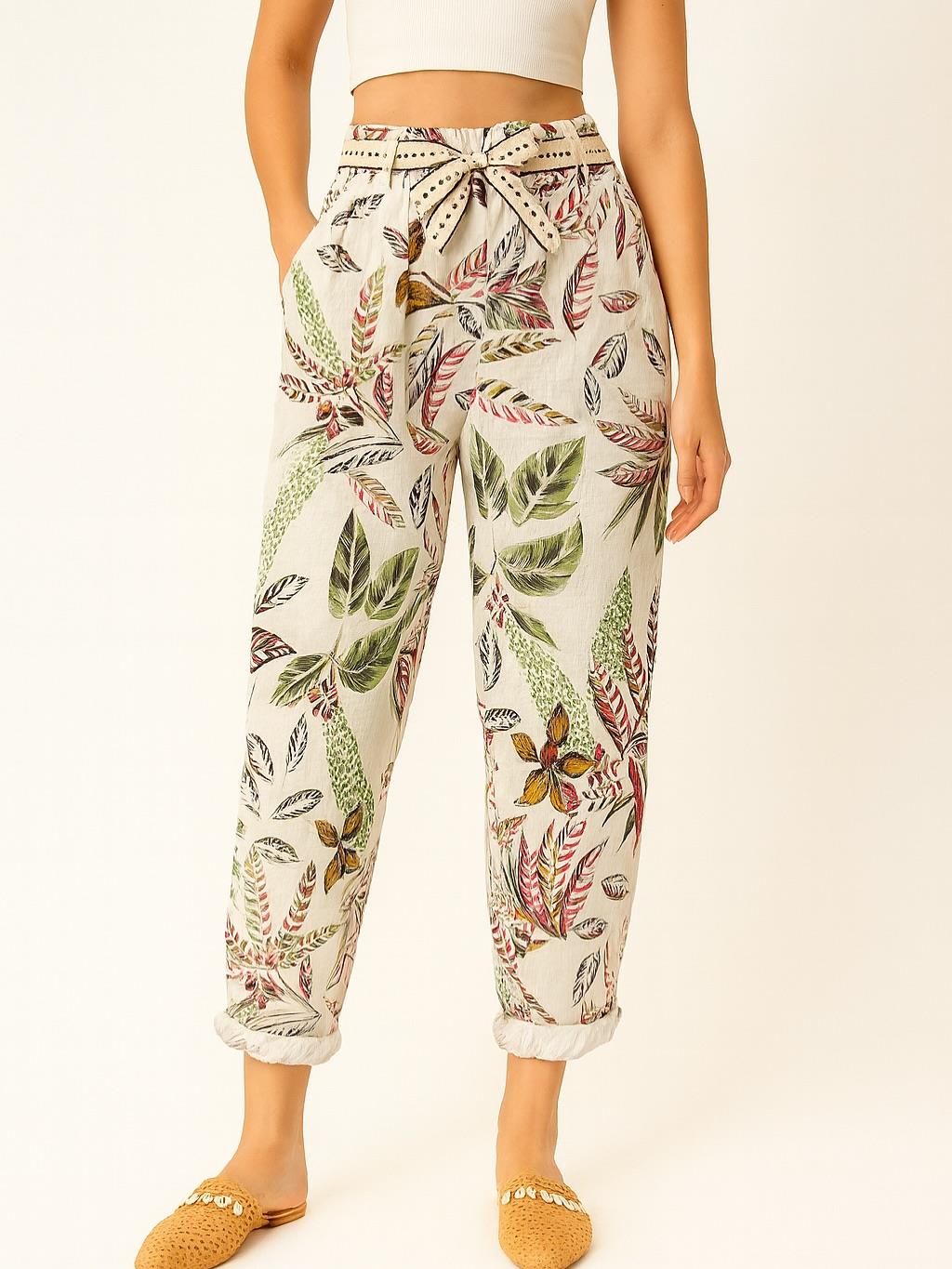 İtalyan Dal Desenli Havuç Keten Pantolon - BEJ