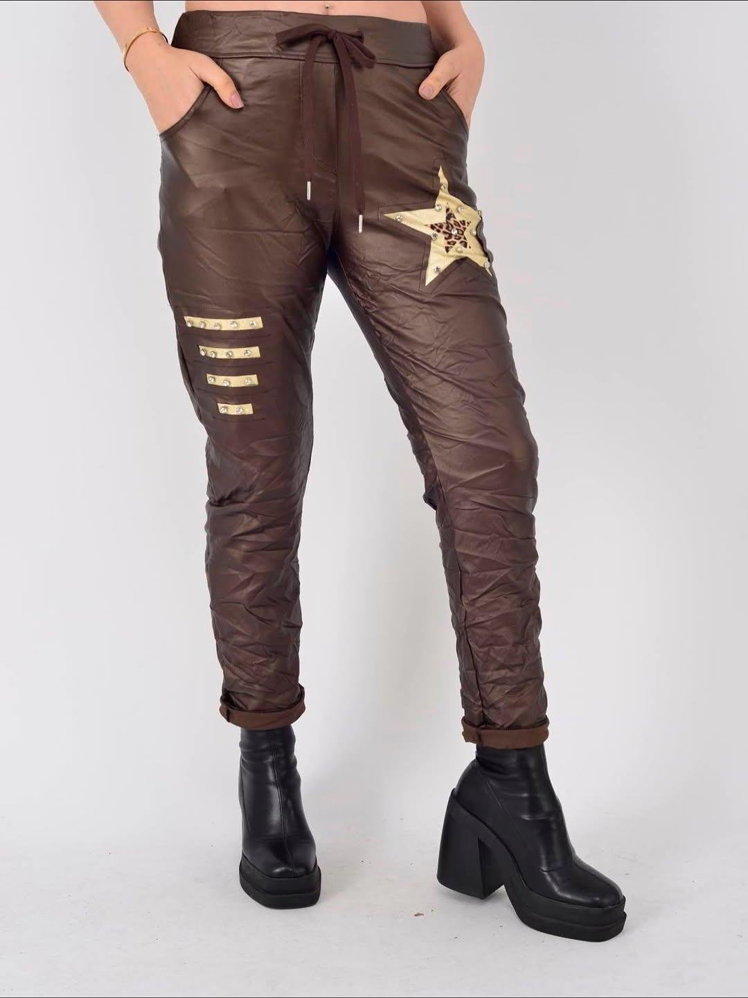 İtalyan Likralı Yıldız Detaylı Deri Pantolon - KAHVERENGİ
