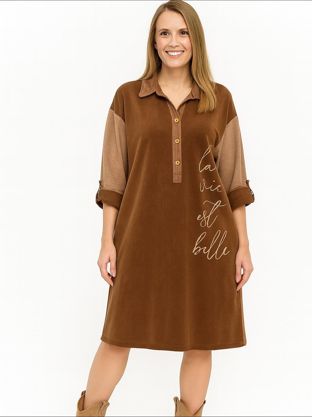 İtalyan Yazı Detaylı Nubuk Elbise - KOYU KAHVE